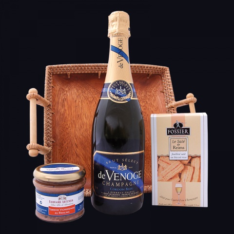 - Champagne De Venoge Cordon Bleu, 750ml - Fossier Salé de Reims - Kachní rilety Eduard Artzner - podnos z tropického dřeva
